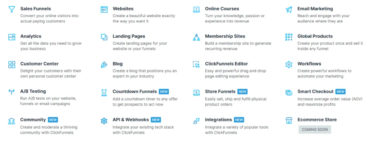 ClickFunnels is an all-in-one marketing and sales platform that simplifies the creation and optimization of sales funnels. It offers customizable templates, drag-and-drop page builders, payment gateway integration, email marketing tools, automation features, and analytics for tracking funnel performance.